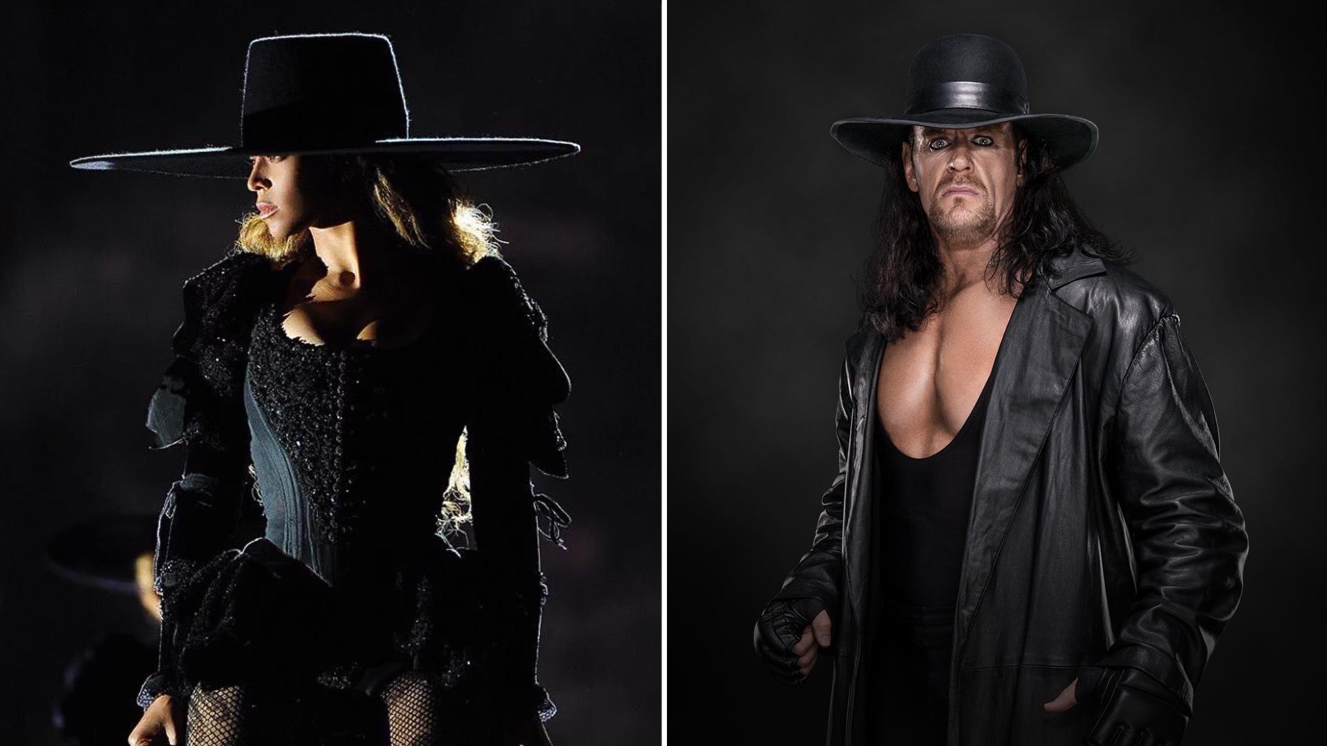 الشهيرة وبيونسيه وهي ترتدي قبعة تشبه تلك التي يرتديها الأسطورة أندرتيكر.